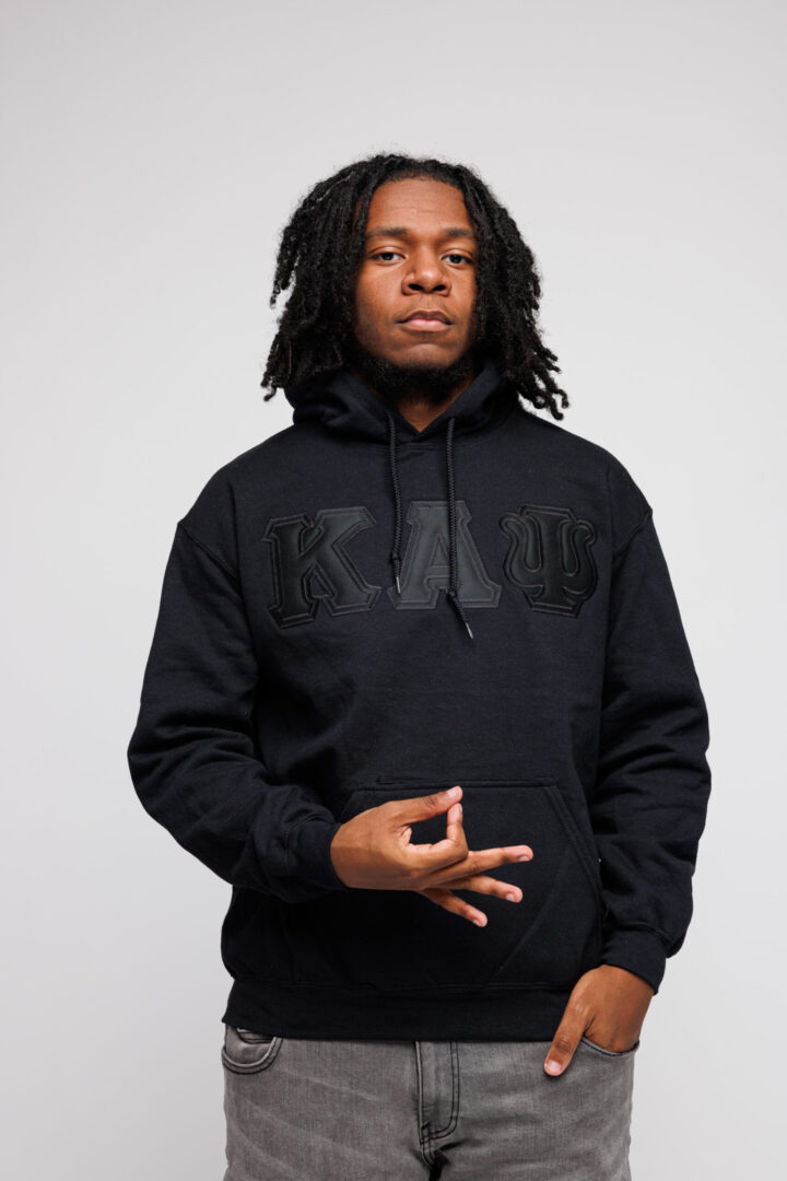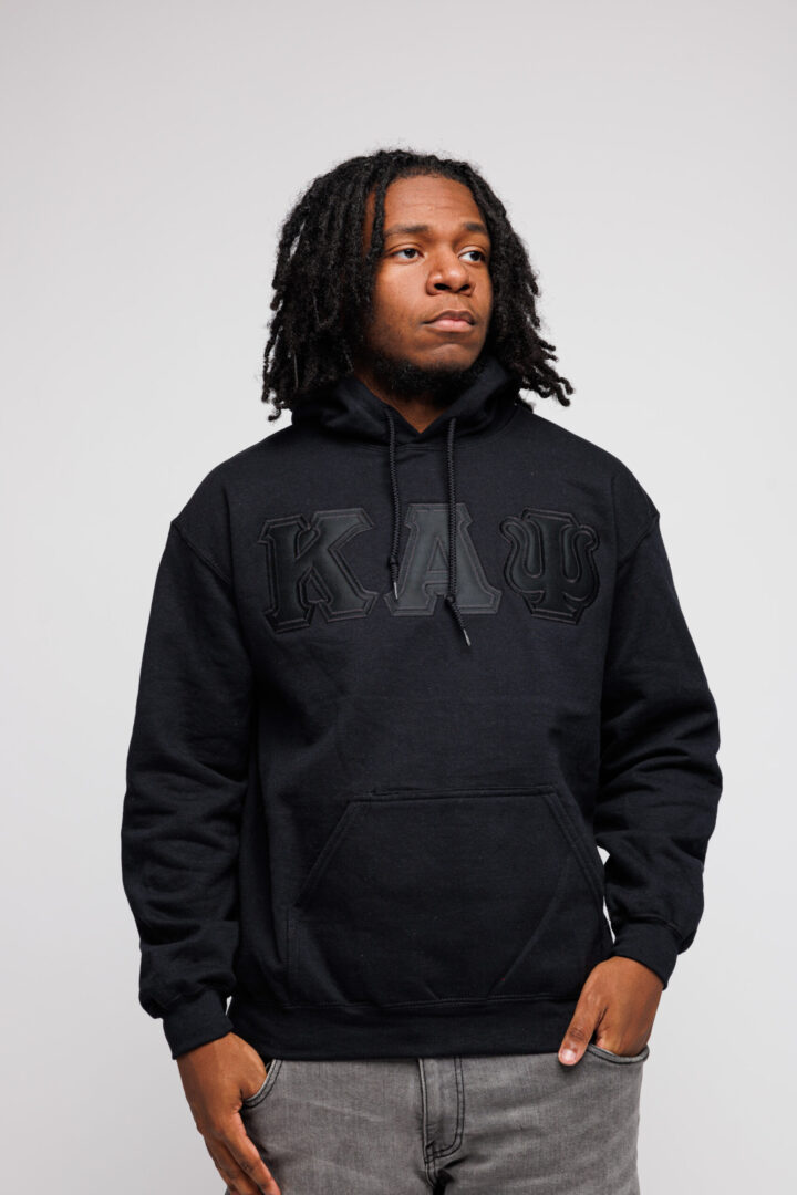Our Exclusive Kappa Alpha Psi Black on Black Lettered Black Hoodie is a must-have for your collection. The ΚΑΨ letters are stitched with appliqué embroidery with a Black background and a Black foreground on a men’s classic fit-sized hoodie. A comfortable hoodie with twill Greek letters embroidery across the chest gives you the perfect fit.