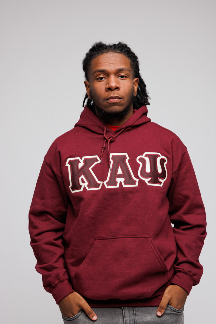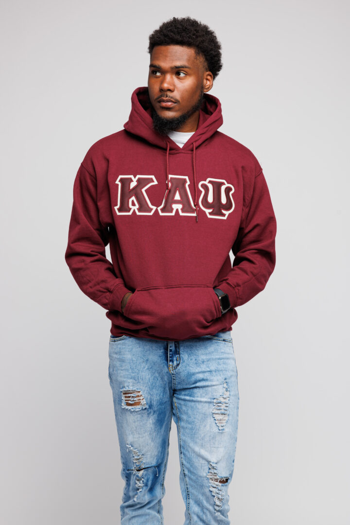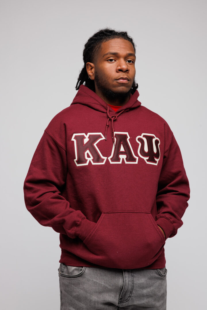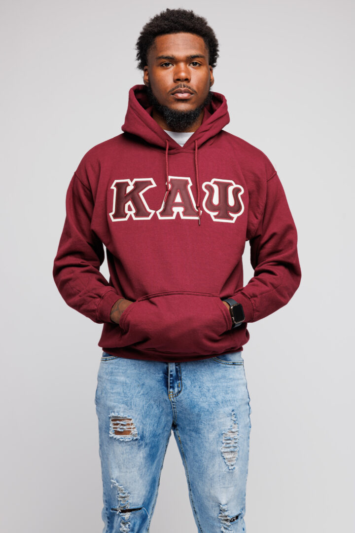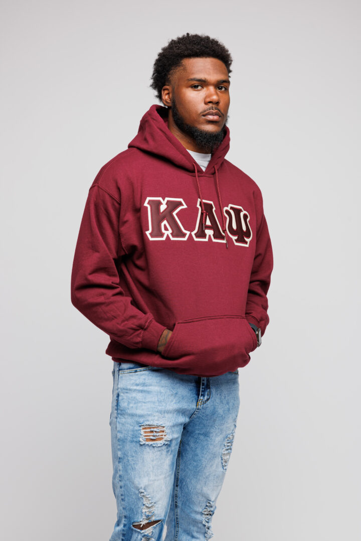 Our Kappa Alpha Psi Krimson and Cream Lettered Krimson Hoodie is a must-have for your collection. The letters are doubled stitched appliqué embroidery with a Cream background and a Krimson foreground on a men’s classic fit-sized hoodie.