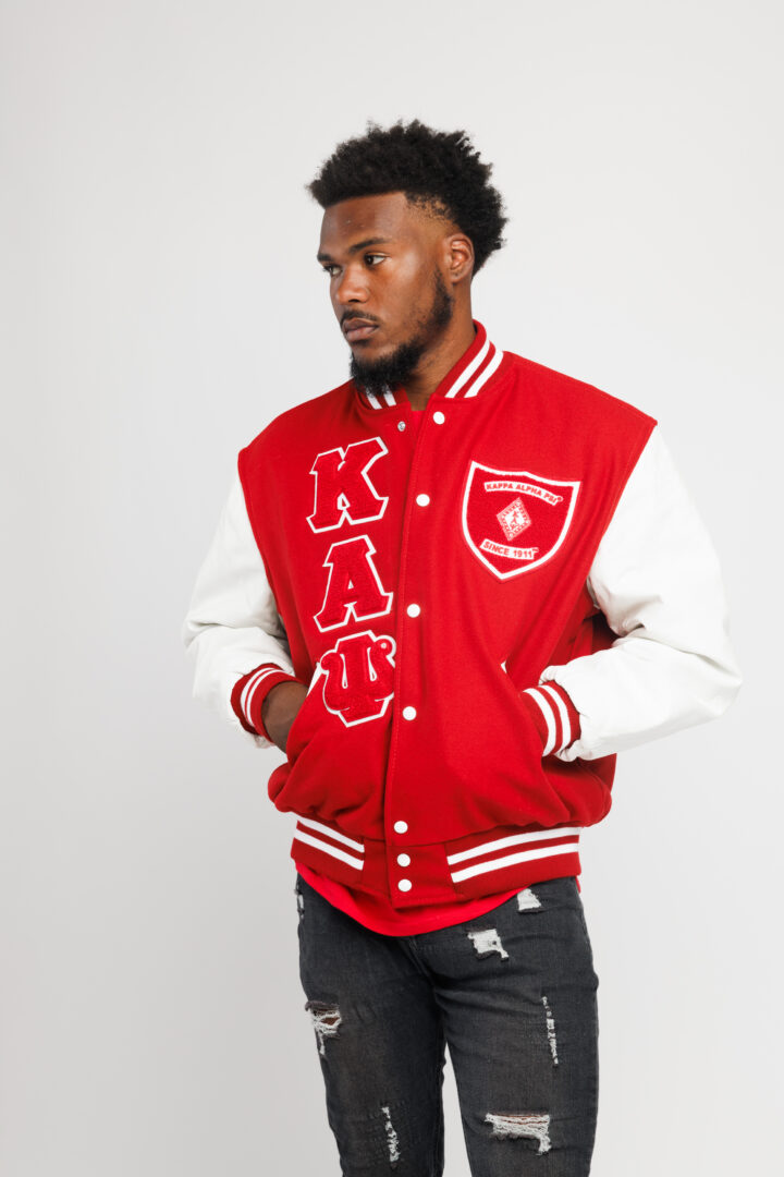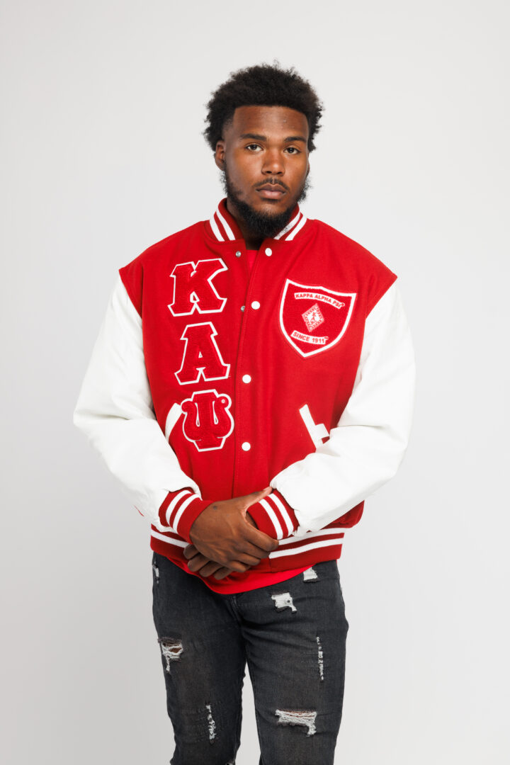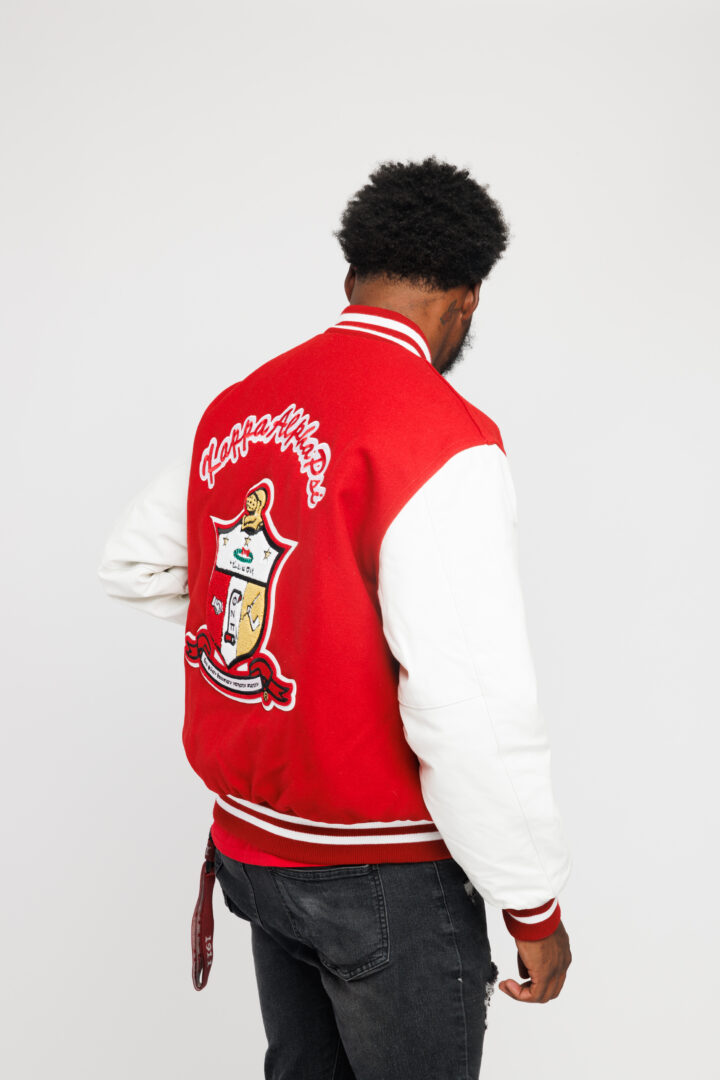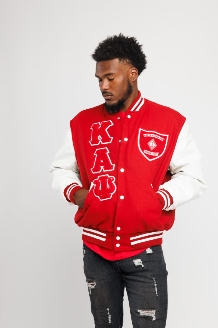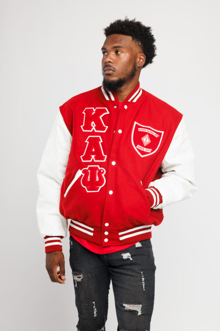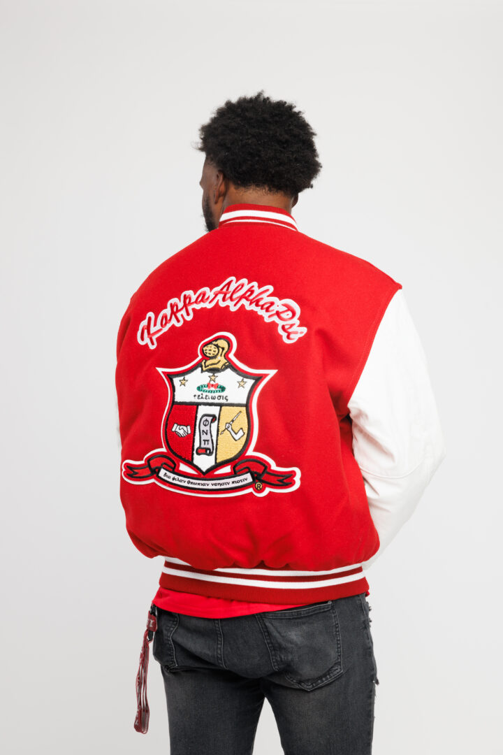 Show your love for Kappa Alpha Psi in the Varsity Jacket by Holloway. This letterman jacket comes in red and white, perfect for showing your fraternity colors. From the full-snap front buttons to the high quality rib trim on the collar, cuffs and fitted hem everything is made of premium material. With leather sleeves, easy-entry front pockets and 24 oz. melton wool.
