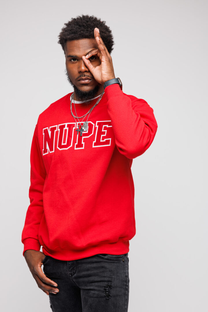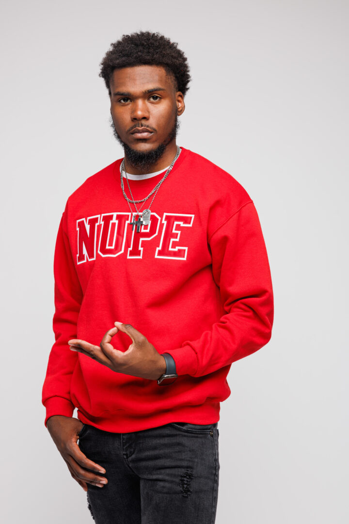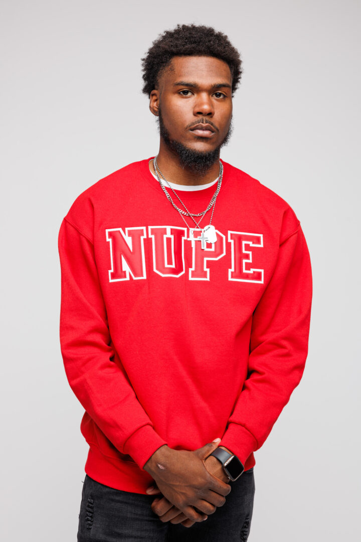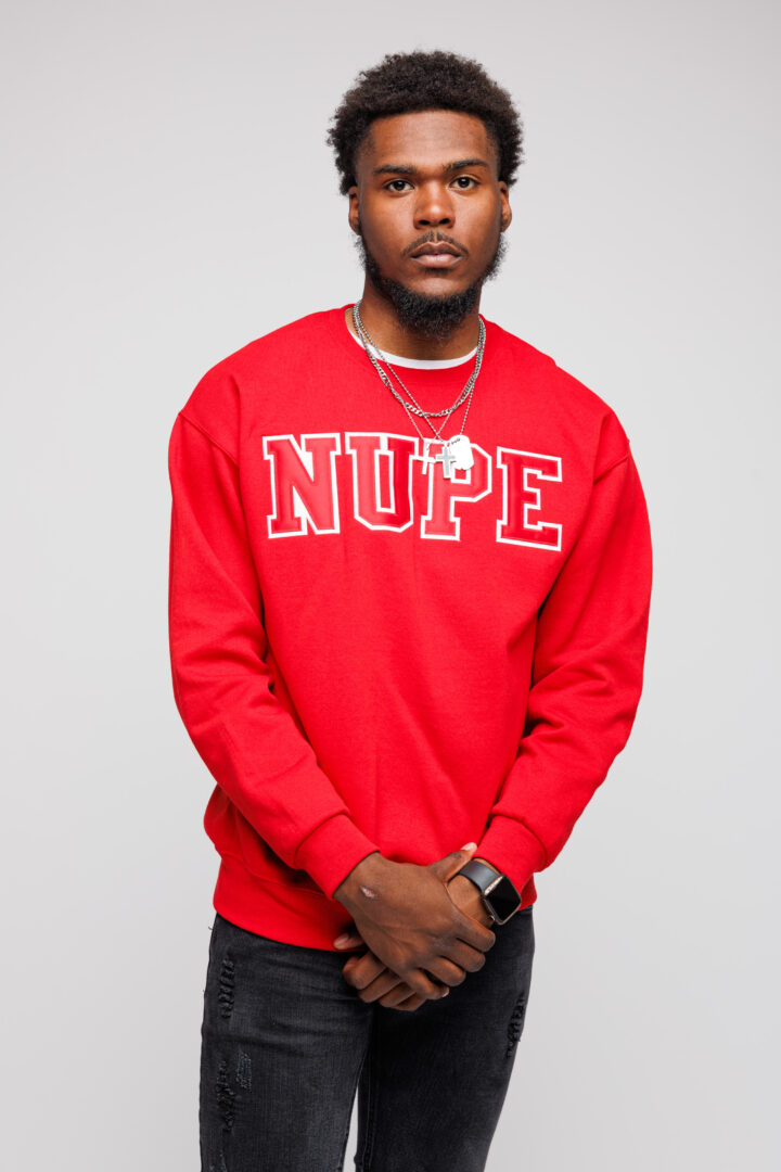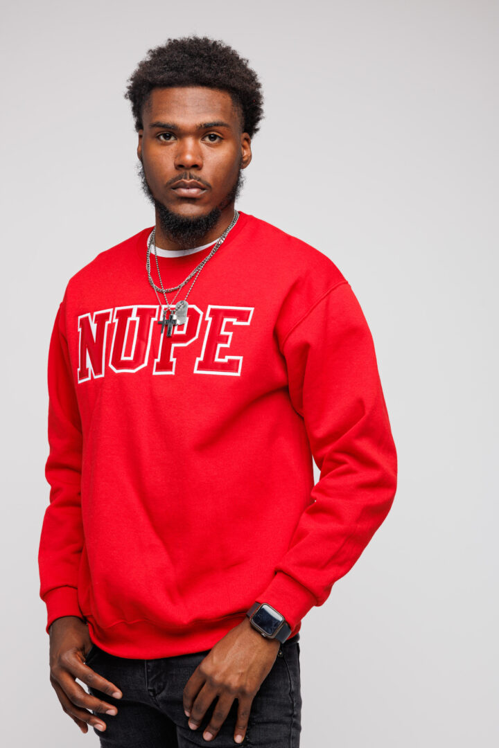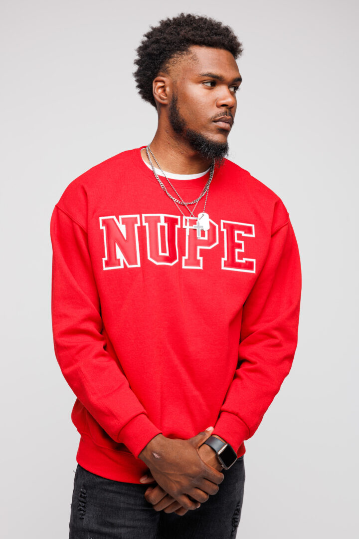 Our NUPE White and Red Lettered Red Crewneck features Double Stitched Appliqué Embroidery with twill Greek letters. The letters are doubled stitched appliqué embroidery with a White background and a Red foreground on a men’s classic fit-sized crewneck.